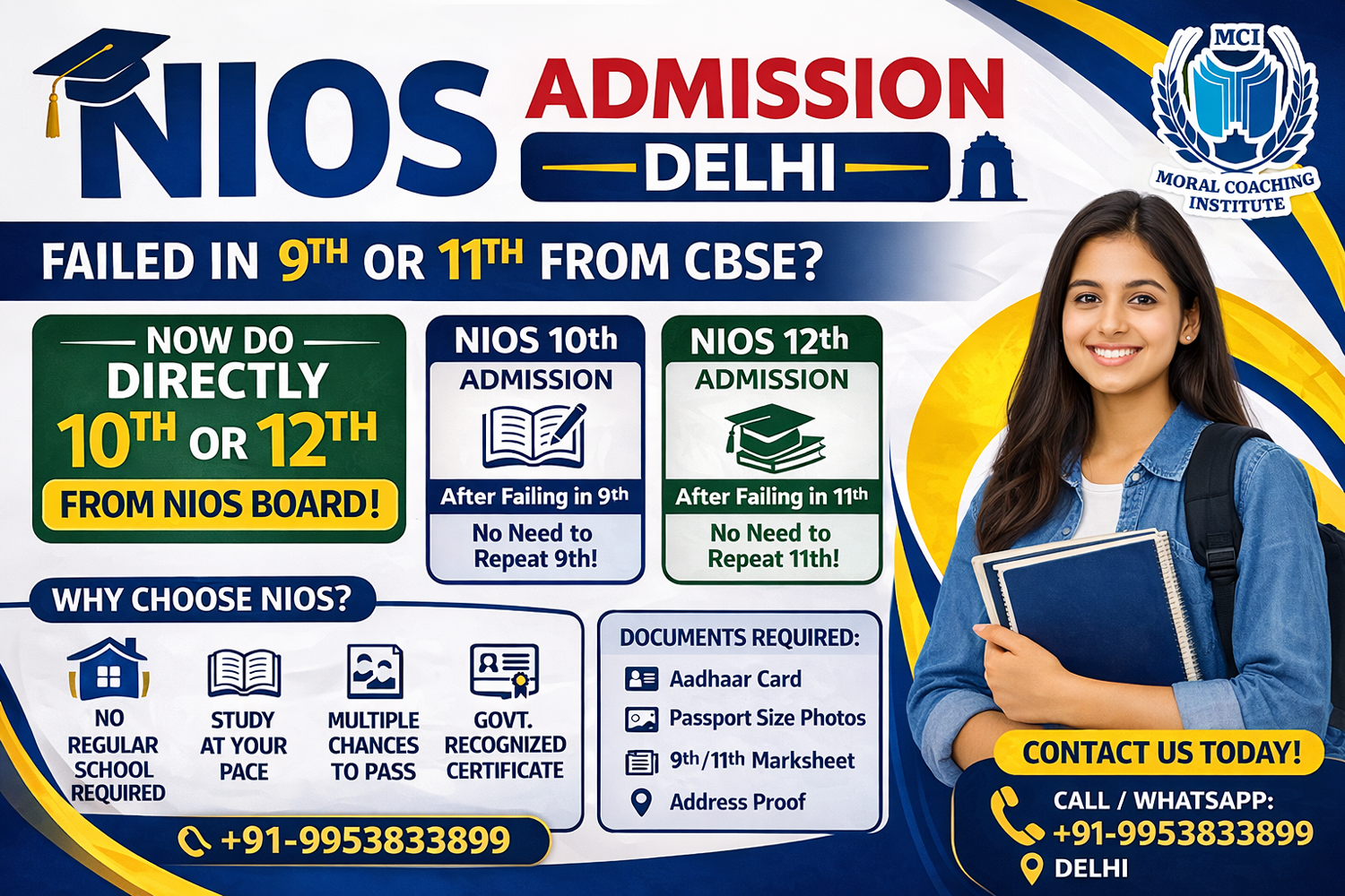 If you have failed in CBSE 9th or 11th class, don’t worry. You don’t have to waste your time repeating the same class. With NIOS (National Institute of Open Schooling), you can directly take admission in 10th or 12th and continue your education smoothly.